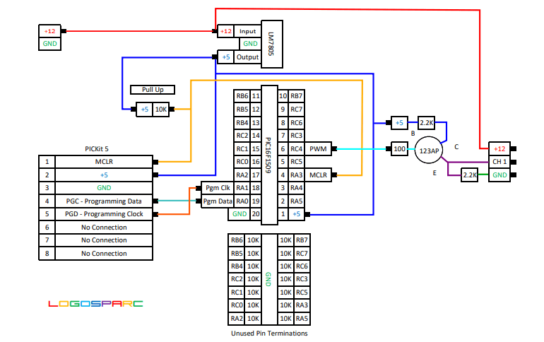 Microcontroller circuit diagram with labeled components.