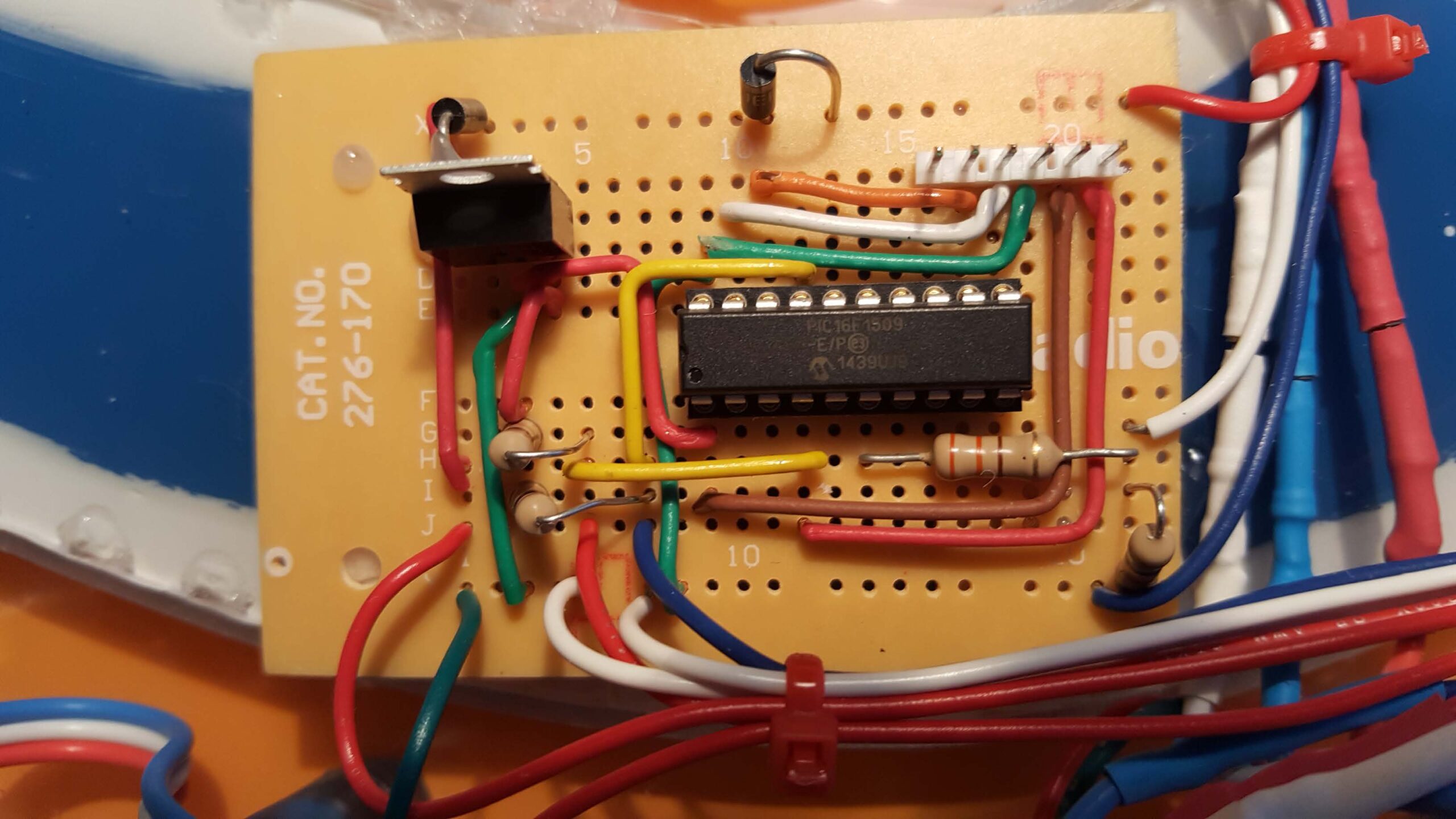 Close-up of an electronic circuit board with wires and an integrated chip.